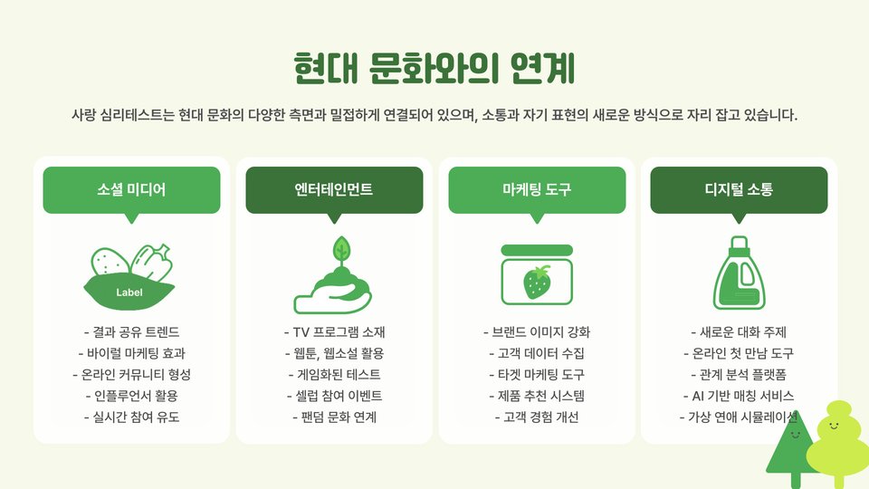 사랑 심리테스트는 단순한 흥미 유발을 넘어서, 관계의 깊이와 품질을 향상시키는 유용한 도구입니다. 현대의 디지털 환경 속에서는 누구나 쉽게 접근할 수 있어, 친구나 연인과 함께 즐기며 실생활에 적용할 수 있는 기회를 제공합니다.