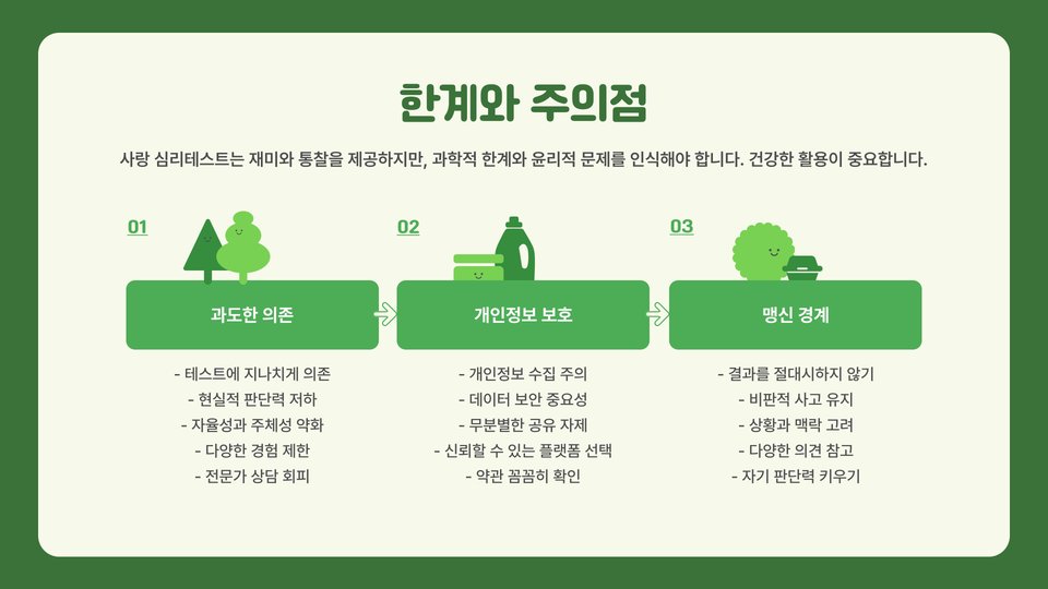 Tip: 사랑 심리테스트의 결과를 무조건 믿기보다는, 이를 참고하여 상대방과 소통하는 데 활용하는 것이 가장 효과적입니다.