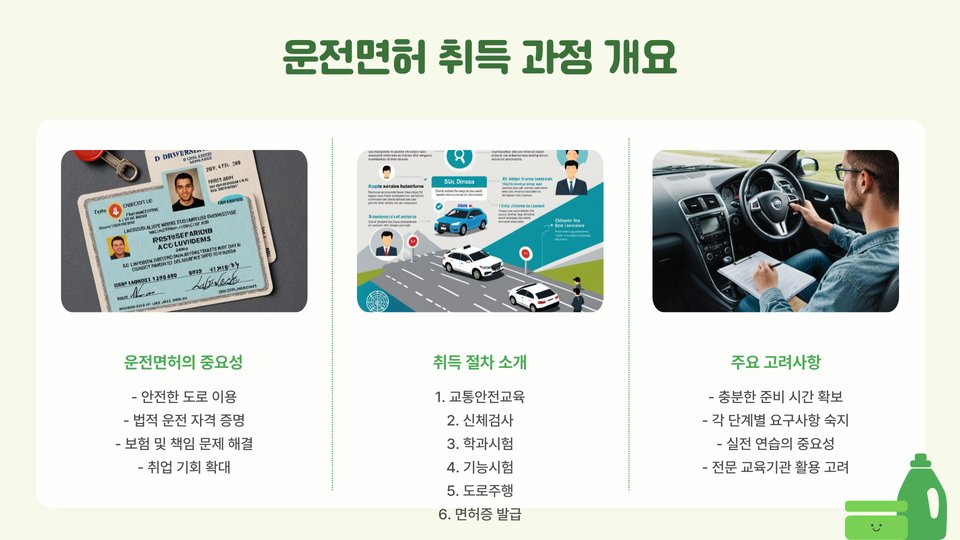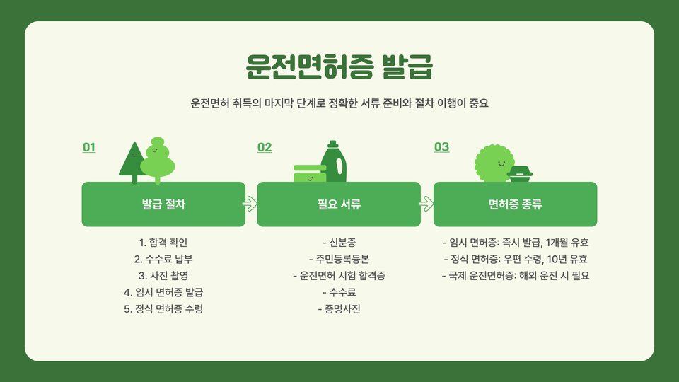 운전면허 취득은 끝이 아닌 시작입니다. 면허를 취득한 후에도 꾸준한 자기계발이 필요합니다. 교통사고 예방과 안전운전이 무엇보다 중요합니다.