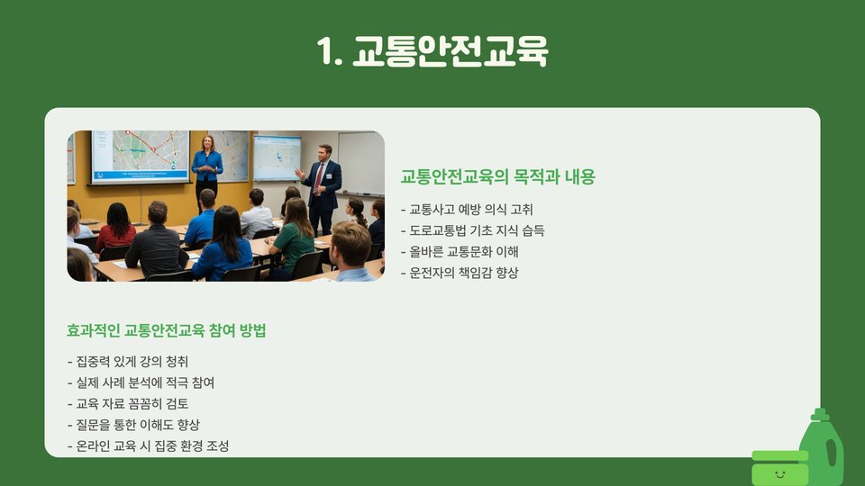 - 안전 운전 교육 및 자동차 정비 교육은 유익합니다.