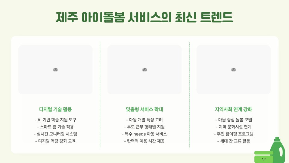 현재 제주 아이돌봄 서비스는 몇 가지 주요 트렌드를 보이고 있습니다. 첫째, 기존의 전통적인 돌봄 방식에서 벗어나, 디지털 기술을 활용한 서비스가 증가하고 있습니다. 예를 들어, 아이돌봄 서비스를 제공하는 앱이나 플랫폼을 통해 부모는 손쉽게 돌보미를 예약할 수 있습니다.