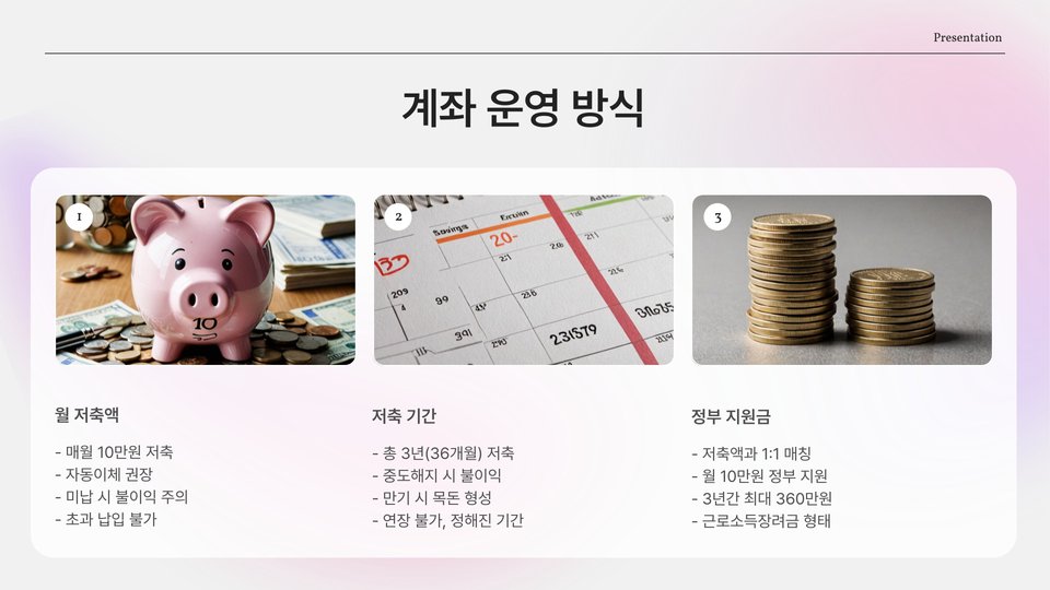 이 계좌는 기본적으로 청년들이 목표한 저축액에 따라 다르게 운영됩니다. 예를 들어, 월 10만원씩 저축할 경우, 3년 이내에 약 500만원의 저축 금액과 정부 지원금을 통해 최소 700만원 이상의 자산을 만들 수 있습니다. 따라서 청년들의 장기적인 재정 계획에 매우 유용한 도구라고 할 수 있습니다. 이 점은 많은 청년들에게 큰 매력으로 작용하고 있습니다.