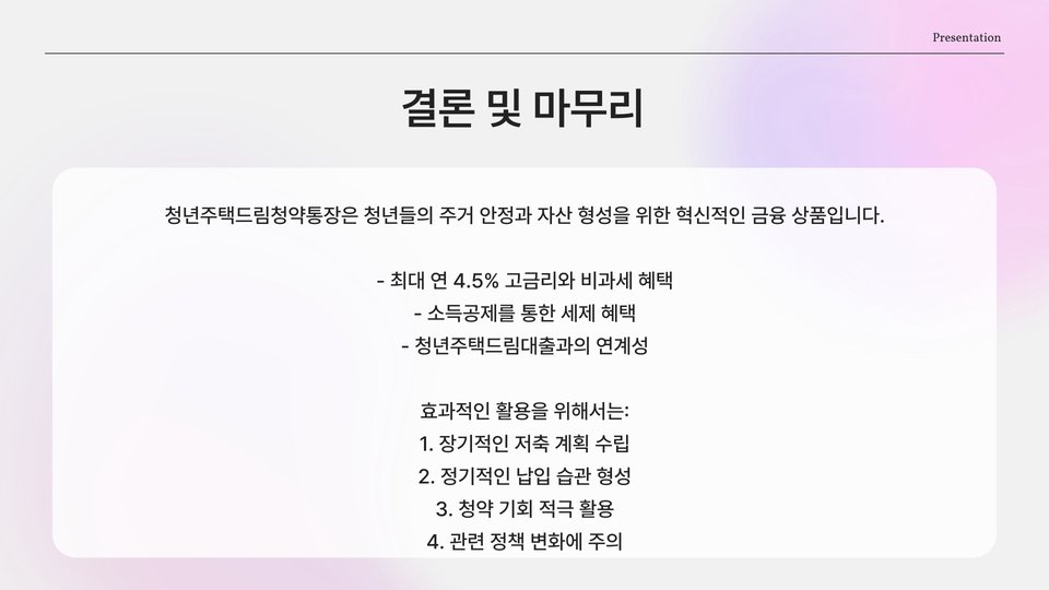 결국, 청년주택드림청약은 청년들이 보다 나은 주거 환경을 확보하기 위한 중요한 프로그램입니다. 주거 안정성을 높이는 데 크게 기여할 수 있으며, 이 프로그램을 활용해 많은 청년들이 미래에 대한 희망을 가지기를 바랍니다. 궁극적으로 이 글이 청년들이 청약을 통한 주거 문제 해결에 도움이 되었기를 바랍니다.