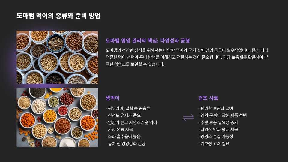 - 정확한 급여량과 다양한 음식을 제공하여 도마뱀의 건강을 증진시키는 것이 중요함.