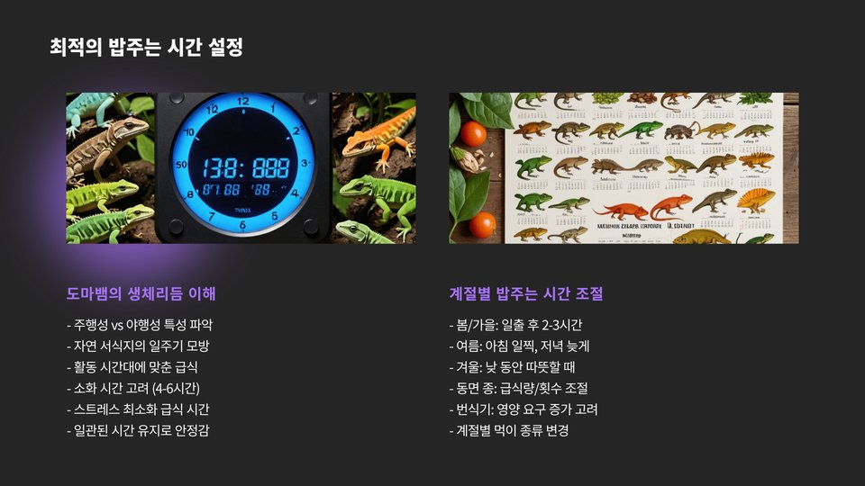 중요 팁: 도마뱀의 식사 시간은 종에 따라 다르므로, 반드시 구체적인 정보를 연구해서 그에 맞게 조정하세요!