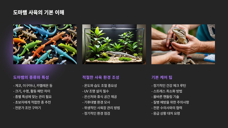 도마뱀을 기르는 것은 단순한 애완동물 관리가 아닌, 그들의 생태와 습관에 대한 깊은 이해와 책임감을 동반합니다. 지속적인 학습과 관찰로, 여러분의 도마뱀을 더욱 행복하게 만들어 보세요!