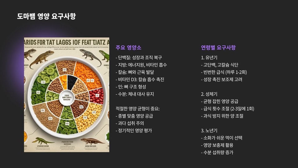 - 정확한 급여량과 다양한 음식을 제공하여 도마뱀의 건강을 증진시키는 것이 중요함.