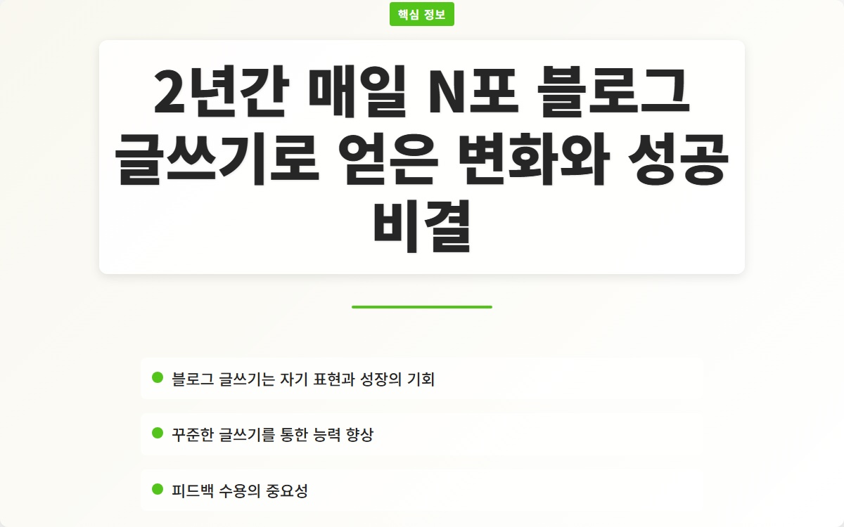 블로그 글쓰기는 단순한 취미가 아니라, 개인의 성장과 발전을 이끄는 강력한 도구입니다. 2년 동안 매일 N포 블로그 글쓰기를 하면서 경험한 변화와 성공 비결을 공유하고자 합니다. 이 글에서는 블로그 글쓰기가 가져다 준 긍정적인 변화와 함께 지속적인 성장의 비결을 알아보겠습니다.
