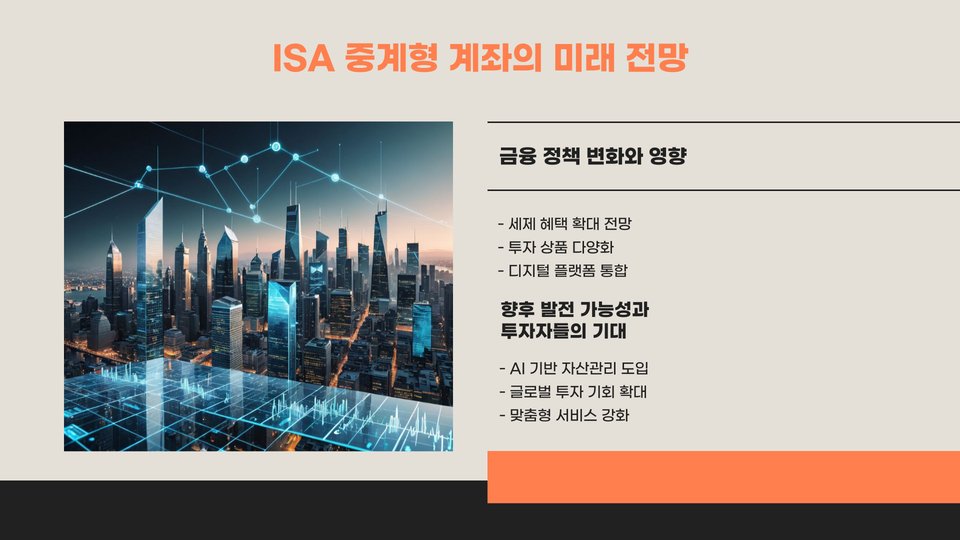 또한, ISA 중계형 소액은 유연한 투자 옵션을 제공합니다. 투자자는 자신의 투자 성향에 맞게 다양한 자산에 투자할 수 있으며, 필요에 따라 언제든지 자산을 이동할 수 있습니다. 이는 투자자가 시장 변화에 빠르게 대응할 수 있게 해줍니다.