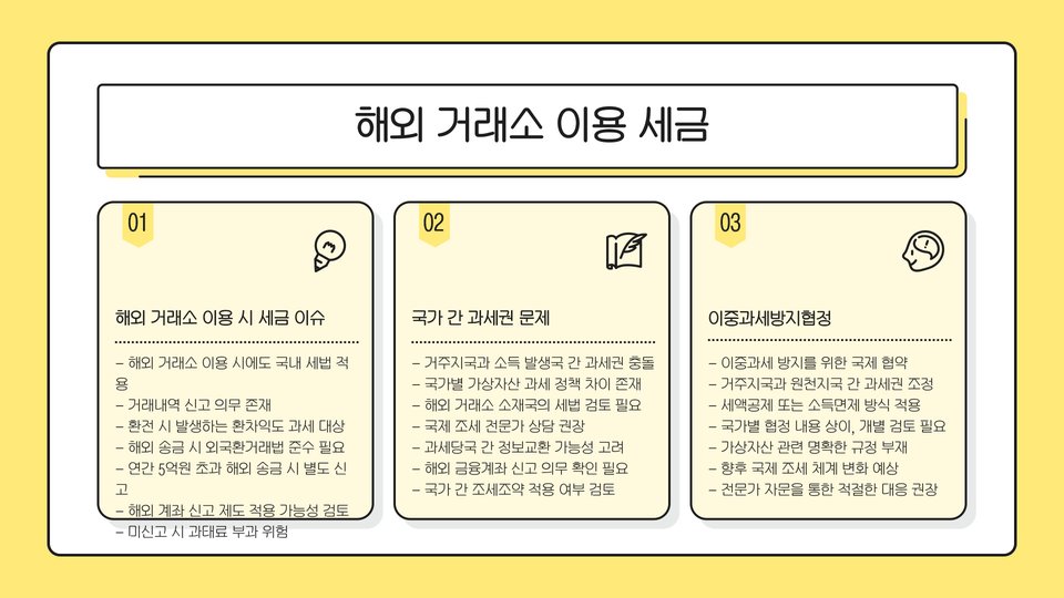 국가마다 세금 규정이 다르기 때문에, 자신의 거주 국가에서 암호화폐에 대한 세금 규정을 정확히 이해하는 것이 필수적입니다. 예를 들어, 한국에서는 2023년부터 암호화폐 거래에 대해 20%의 세금을 부과할 예정이며, 이로 인해 많은 투자자들이 세금 처리에 대한 고민을 하고 있습니다.