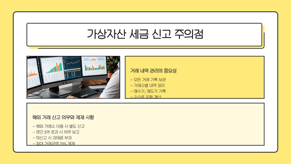 특히, 세금 신고를 체계적으로 하려면 정확한 거래 기록을 유지하는 것이 필수적입니다. 거래 내역을 정리하고, 발생한 수익을 계산하는 과정이 필요합니다. 이러한 기록은 세금 신고 시 중요한 증빙자료로 활용될 수 있습니다.