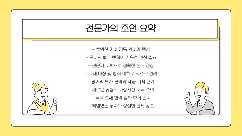 전문가들은 또한 세금 절세 전략에 대해 조언할 수 있습니다. 예를 들어, 특정 기간 동안의 거래 결과를 분석하여 손실을 활용하는 방법이나, 자산 배분을 통해 세금을 최소화하는 방법을 안내받을 수 있습니다.